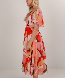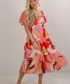 If a patio and some drinks are on the agenda, then you know that the All Coming Together Coral Tiered Midi Dress is going to be there! This eye-catching dress features a vibrant coral-toned abstract print that’s perfect for sunny days and special occasions alike. The flutter sleeves add a soft, feminine touch, while the tiered midi-length skirt creates beautiful movement with every step. Made from a lightweight, breathable fabric, this dress is both comfortable and flattering. Pair it with sandals or wedges for an effortlessly chic look that’s sure to turn heads! Lightweight Woven Knit Fabrication Colorful Abstract Print V-Neckline Elastic Shoulders Short Flutter Sleeves Flowy Tiered Fit Smocked Back Midi Length Lined Body, Unlined Sleeves Self: 70% Viscose, 30% Nylon Lining: 100% Rayon Hand Wash Cold, Line Dry Models are 5’6″ + 5’9.5″ and are wearing a Small.Garment Measurements in Inches:Small | Bust 26″ | Waist 24″ | Hips 36″ | Length 47″Medium | Bust 28″ | Waist 26″ | Hips 38″ | Length 47.5″Large | Bust 30″ | Waist 28″ | Hips 40″ | Length 48″