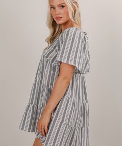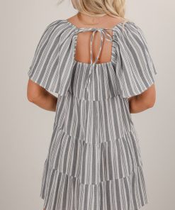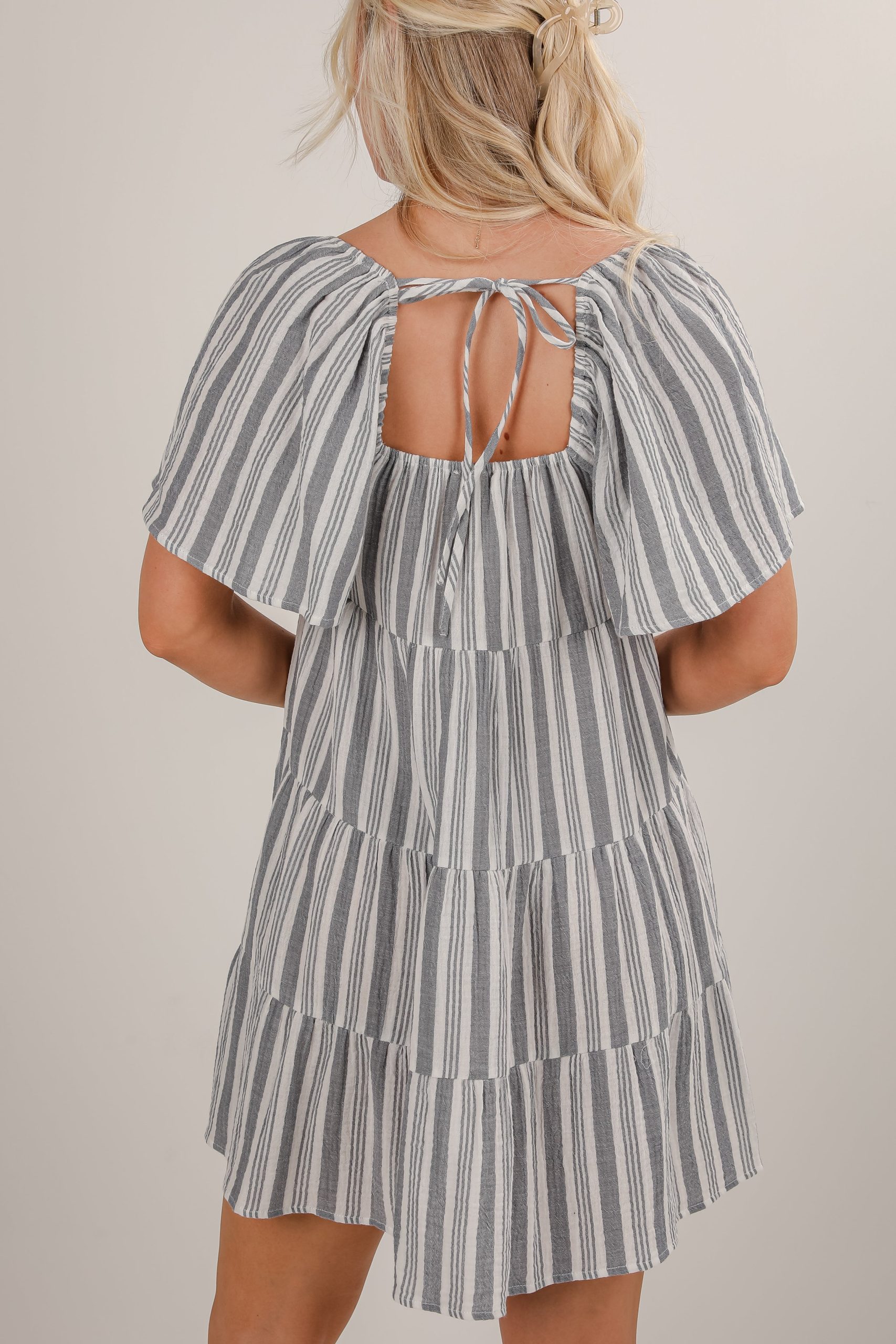 The perfect blend of charm and sophistication, this sweet Swiss Dot dress will turn heads at every summer event! This lightweight dress features a playful tiered silhouette that flows effortlessly with every step, while the denim and white stripes give it a fresh, coastal vibe. Made from breathable linen, it’s perfect for warm-weather days, keeping you cool and comfortable. Adjustable straps and a relaxed fit make it as flattering as it is fun—just add sandals and sunnies for a carefree, sun-soaked look! Lightweight Crinkle Linen Fabrication Striped Print V-Neckline Elastic Shoulders Short Flutter Sleeves Flowy Tiered Fit Open Back with Functional Tie Short/Mini Length 100% Cotton Hand Wash Cold, Hang or Line Dry Model is 5’6″ and wearing a Small.Garment Measurements in Inches:Small | Bust 34″ | Waist 36″ | Hips 50″ | Length 32″Medium | Bust 36″ | Waist 38″ | Hips 52″ | Length 33″Large | Bust 38″ | Waist 40″ | Hips 54″ | Length 34″
