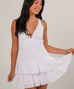 Go ahead and catch everyone’s attention with the In Your Prime Ruffle Mini Dress! This lightweight dress features delicate spaghetti straps that tie in the back for a customizable and romantic touch. The ruffled detailing adds movement and charm, while the mini length keeps it fun and playful. Perfect for date nights, summer outings, or special occasions, this dress pairs beautifully with heels or sandals for an effortlessly pretty look! Available in 2 colors. Lightweight Textured Cotton Fabrication V-Neckline Spaghetti Straps that Criss-Cross + Tie in the Back Flowy Tiered Ruffle Fit Short/Mini Length Fully Lined Self: 100% Cotton Lining: 100% Polyester Hand Wash Cold, Hang or Line Dry Models are 5’4″ and are wearing a Small.Garment Measurements in Inches:Small | Bust 26” | Waist 26” | Hips 28” | Length 35”Medium | Bust 28” | Waist 28” | Hips 30” | Length 35.5”Large | Bust 30” | Waist30 ” | Hips 32” | Length 36”