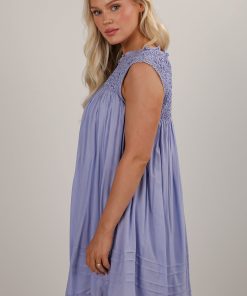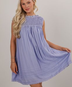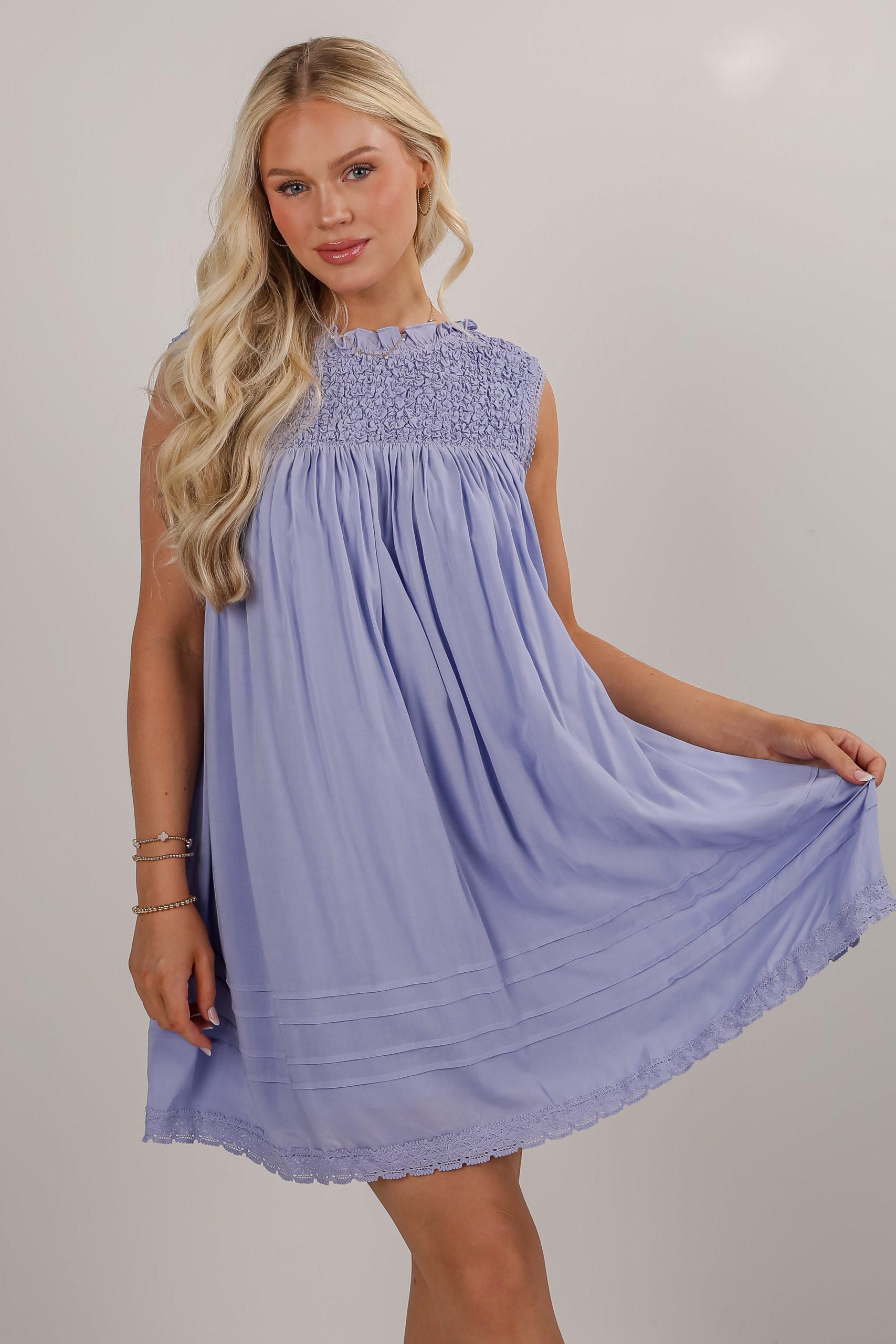 Warm days and easy plans pair best with the Something Sweet Lavender Mini Dress! This delicate dress features a soft lavender hue with intricate lace detailing that adds a touch of elegance. The sleeveless design and flowy silhouette make it perfect for warm days and special occasions alike. Whether you’re headed to a garden party, bridal shower, or date night, this mini dress pairs beautifully with heels or sandals for a sweet, feminine look! Lightweight Woven Knit Fabrication Ruffled Rounded Neckline Smocked Upper Sleeveless Flowy Fit Lace-Trimmed Bottom Hem Functional Back Button + Keyhole Short/Mini Length Fully Lined Self + Lining: 100% Rayon Hand Wash Cold, Lay Flat to Dry Model is 5’6″ and wearing a Small.Garment Measurements in Inches:Small | Bust 36” | Waist 38” | Hips 46” | Length 35”Medium | Bust 38” | Waist 40” | Hips 48” | Length 36”Large | Bust 40” | Waist 42” | Hips 50” | Length 37”