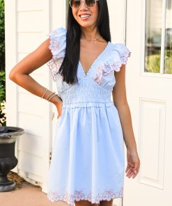 You’ll always arrive on the scene in perfectly compliment-worthy style with the Sweet As Can Be Light Blue Cherry Mini Dress! Crafted from a lightweight fabric, it features a sleeveless design and an elastic waistband for a flattering, comfortable fit. The charming red cherry embroidery along the hem adds a fun, whimsical touch that makes this piece stand out. Pair it with sneakers for a casual daytime look or dress it up with sandals and a straw bag for a picnic-ready outfit! Lightweight Cotton Fabrication Cherry Embroidered Trim Smocked Elastic Ruffled V-Neckline V-Back Ruffle Cap Sleeves Smocked Elastic Waistband Flowy Fit Short/Mini Length Fully Lined Self: 100% Cotton Lining: 90% Polyester, 10% Spandex Hand Wash Cold, Hang or Line Dry Models are 5’4″ and are wearing a Small.Garment Measurements in Inches:Small | Bust 34” | Waist 28” (Stretches up to 34″) | Hips 52” | Length 34”Medium | Bust 36” | Waist 30” (Stretches up to 36″) | Hips 54” | Length 35”Large | Bust 38” | Waist 32” (Stretches up to 38″) | Hips 56″ | Length 36″