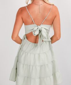Flirt your way through any evening with the With Great Love Sage Tiered Mini Dress! Featuring adjustable spaghetti straps for the perfect fit, this dress is designed with a flowy tiered silhouette that moves effortlessly with you. The soft sage hue adds a fresh, natural touch, while the lightweight fabric keeps it cool and comfortable. Dress it up with wedges for brunch or keep it casual with sandals for an easy, everyday look! Lightweight Woven Knit Fabrication Sweetheart Neckline Adjustable Spaghetti Straps Flowy Tiered Fit Elastic Waistband in the Back Open Back with Functional Tie Short/Mini Length Fully Lined Self + Lining: 100% Polyester Hand Wash Cold, Hang or Line Dry Model is 5’4″ and wearing a Small.Garment Measurements in Inches:Small | Bust 30” | Waist 30” | Hips 40” | Length 36”Medium | Bust 32” | Waist 32” | Hips 42” | Length 37”Large | Bust 34” | Waist 34” | Hips 44” | Length 37”